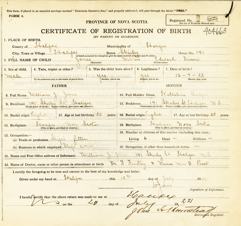 21. Name and Post Office address of Informant William J. Jones 141 Shirley St, Halifax