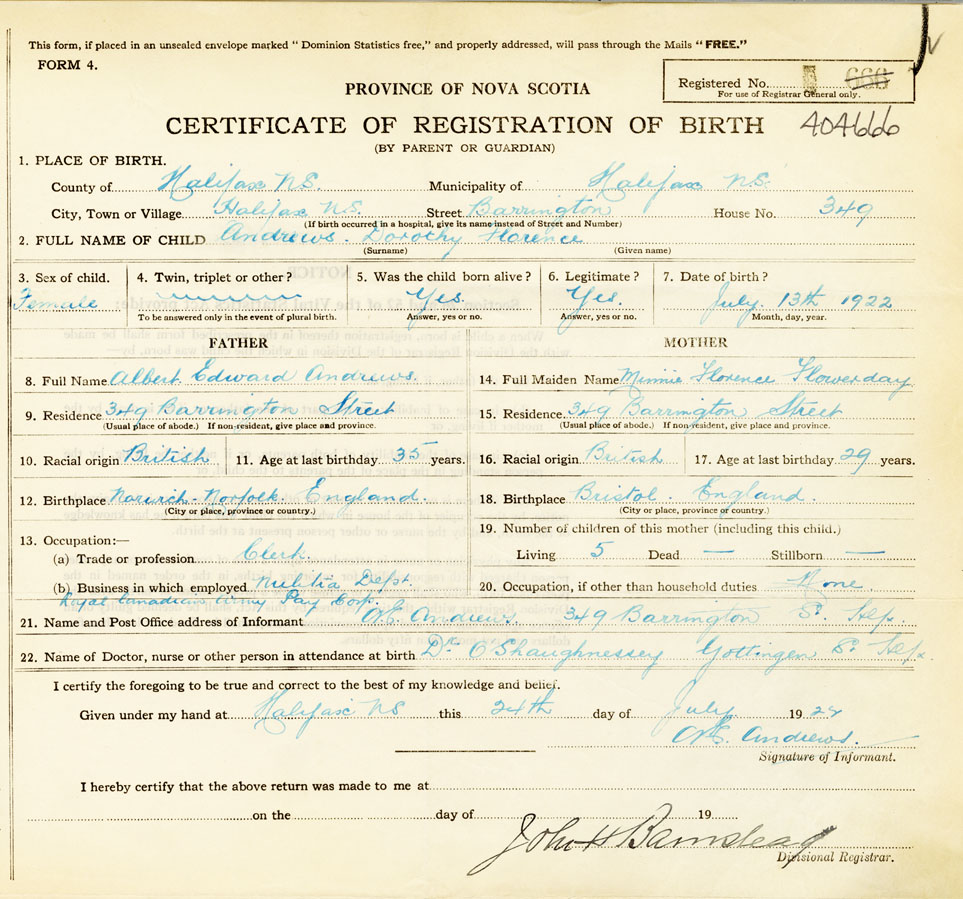 22. Name of Doctor, nurse or other person in attendance at birth Dr. O'Shaughnessey Gottingen Street Halifax