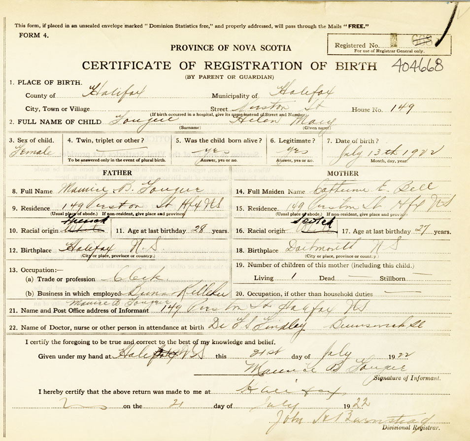 21. Name and Post Office address of Informant Maurice B. Fougere 149 Preston St. Halifax