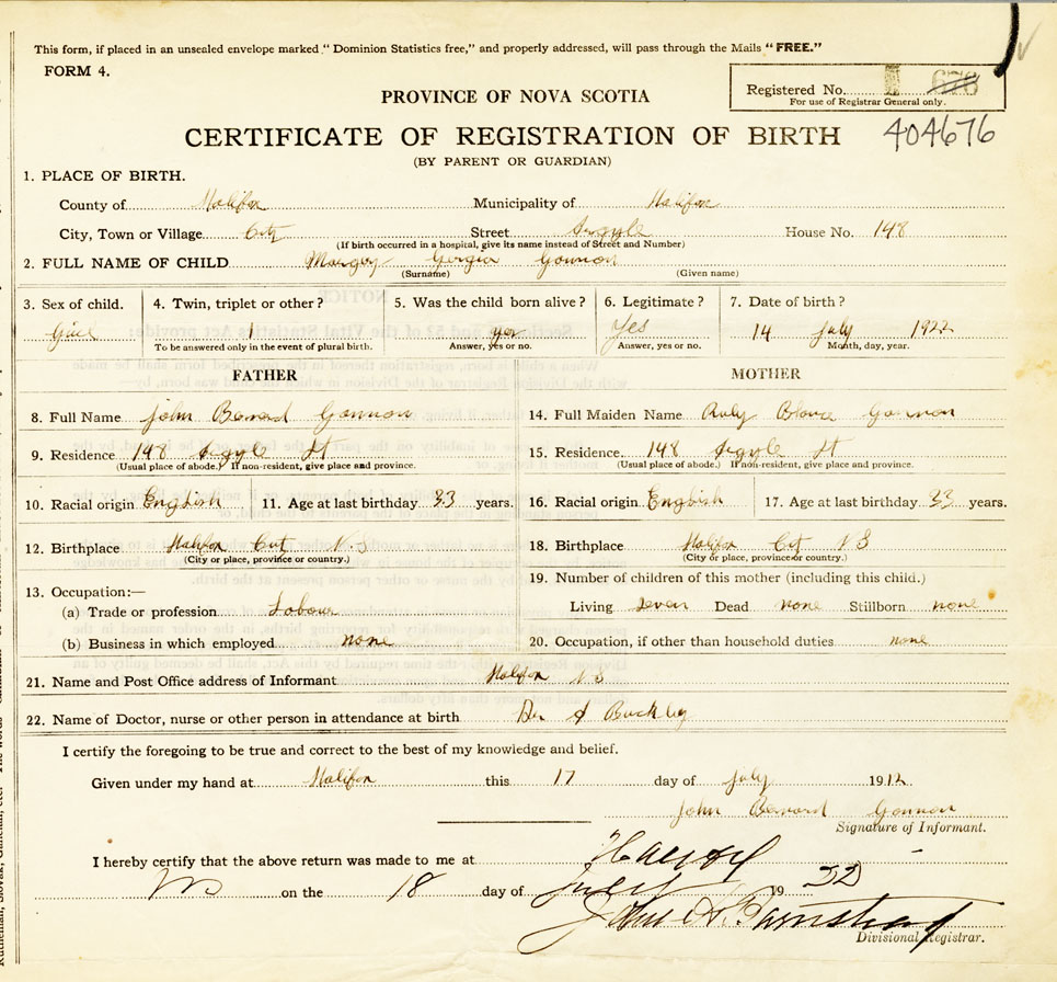 21. Name and Post Office address of Informant John Bernard Gannon 148 Argyle St., Halifax City