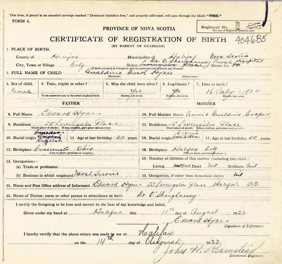 21. Name and Post Office address of Informant Edward Hynes 25 Livingston Place Halifax