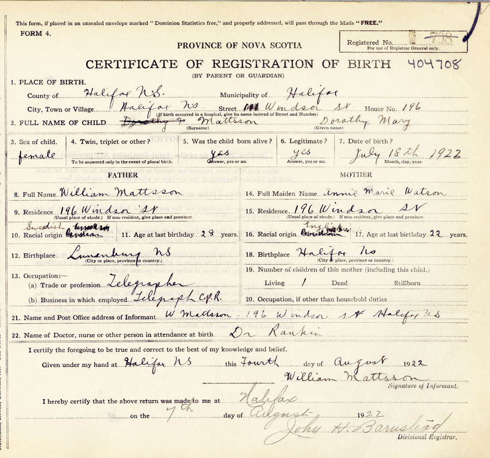 21. Name and Post Office address of Informant W.Mattson 196 Windsor St., Halifax