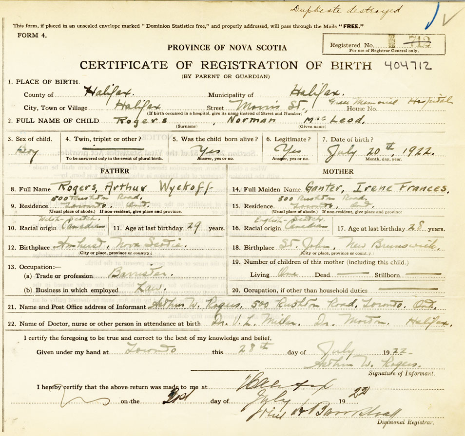 21. Name and Post Office address of Informant Arthur W. Rogers 500 Rushton Road, Toronto, Ont.