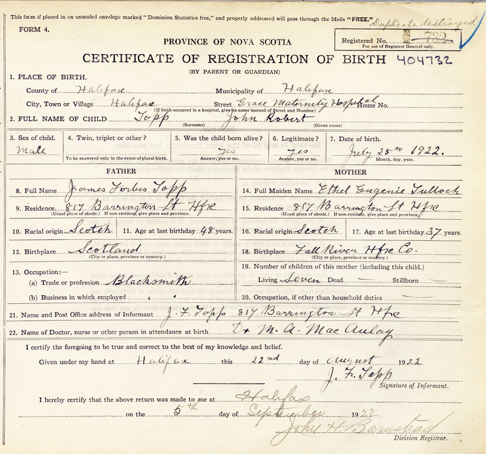 21. Name and Post Office address of Informant J. F. Topp 817 Barrington St Halifax