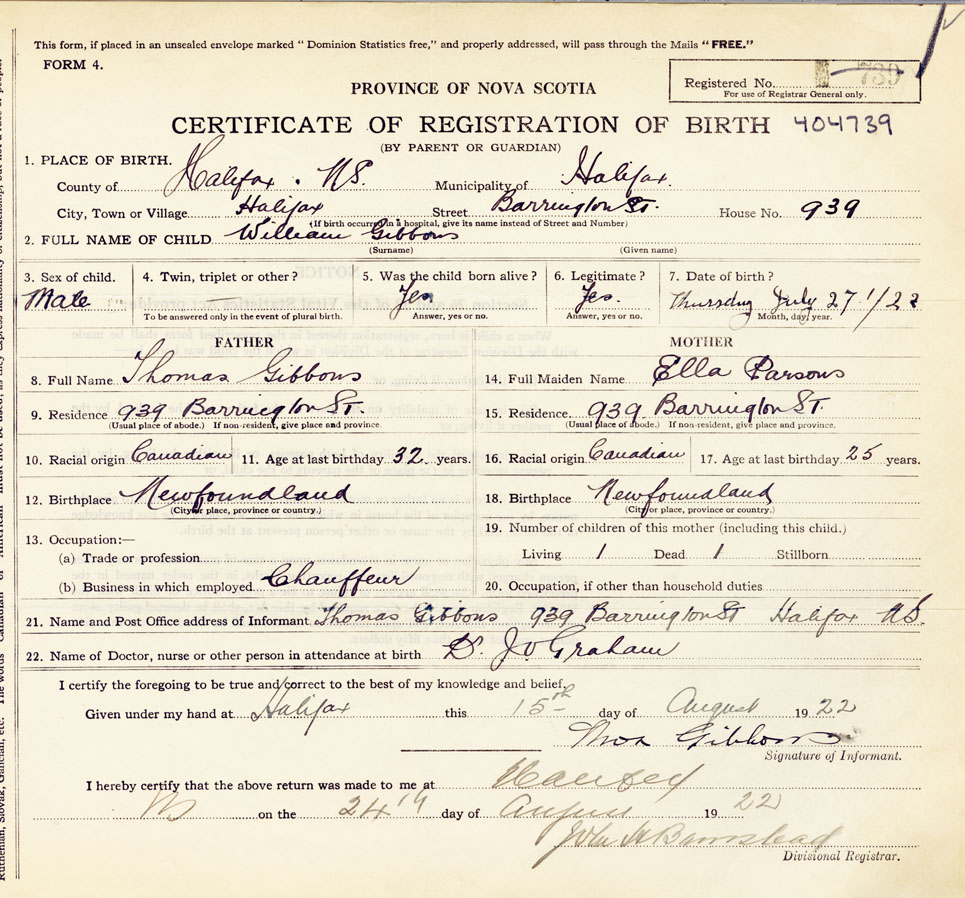 21. Name and Post Office address of Informant Thomas Gibbons 939 Barrington St Halifax