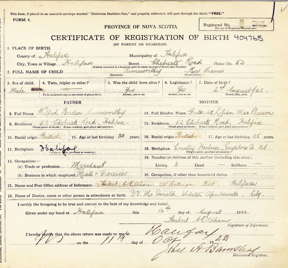 21. Name and Post Office address of Informant Herbert A Oldham 238 Gottingen Street Halifax