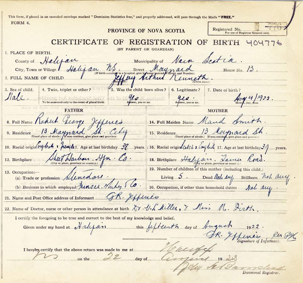 21. Name and Post Office address of Informant GR Jefferies 13 Maynard St Halifax City