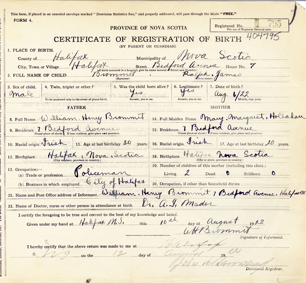 21. Name and Post Office address of Informant William Henry Brommit 7 Bedford Avenue Halifax