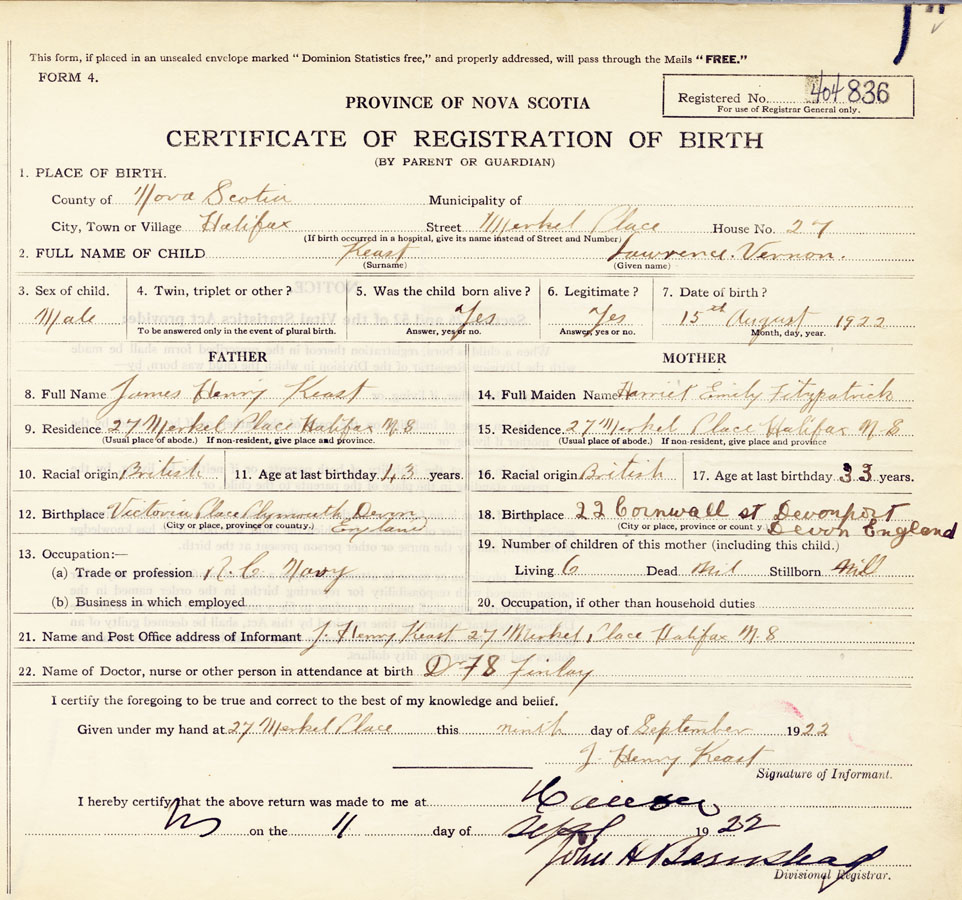 21. Name and Post Office address of Informant J. Henry Keast 27 Merkel Place, Halifax