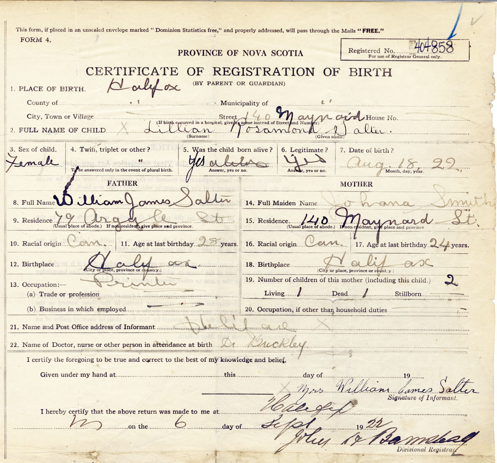 21. Name and Post Office address of Informant Mrs William James Salter Halifax