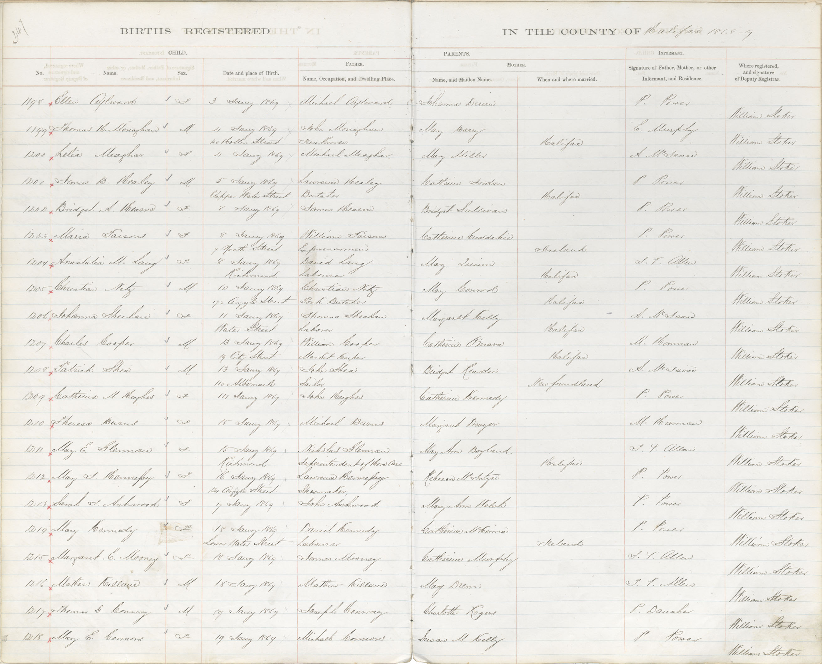 Birth Registration: Year: 1869 book: 1809 page: 247 number: 1218