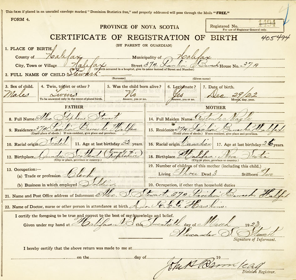 21. Name and Post Office address of Informant Alex S. Stewart 37A Pavilion Barracks Halifax