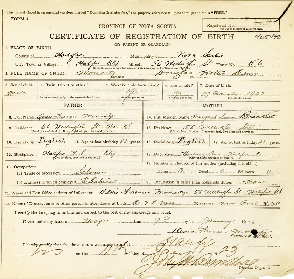 21. Name and Post Office address of Informant Denis Francis Moriarty 56 Wellington St., Halifax