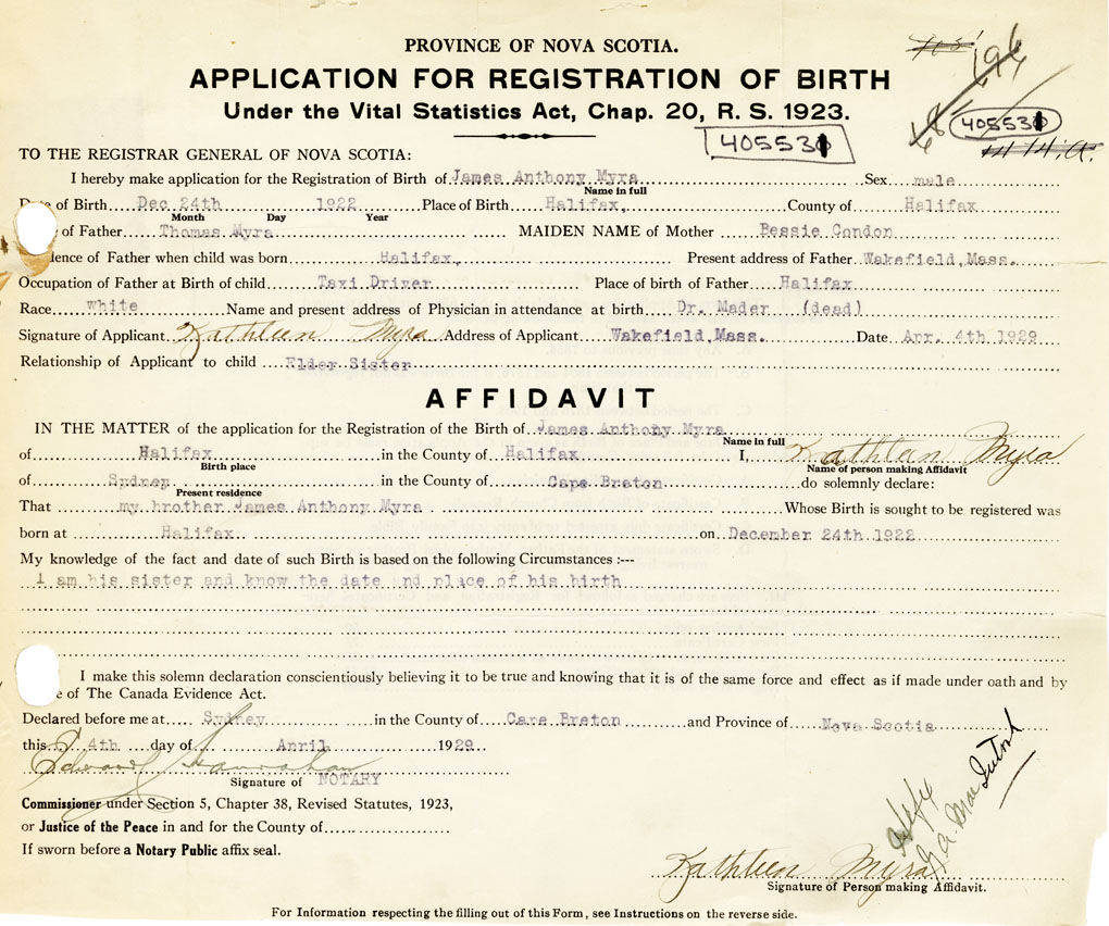 I hereby make application for the Registration of Birth of James AnthonyMyra Sex Male