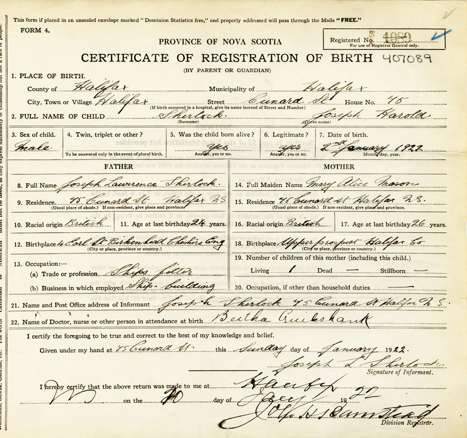 21. Name and Post Office address of Informant Joseph Sherlock 45 Cunard St Halifax