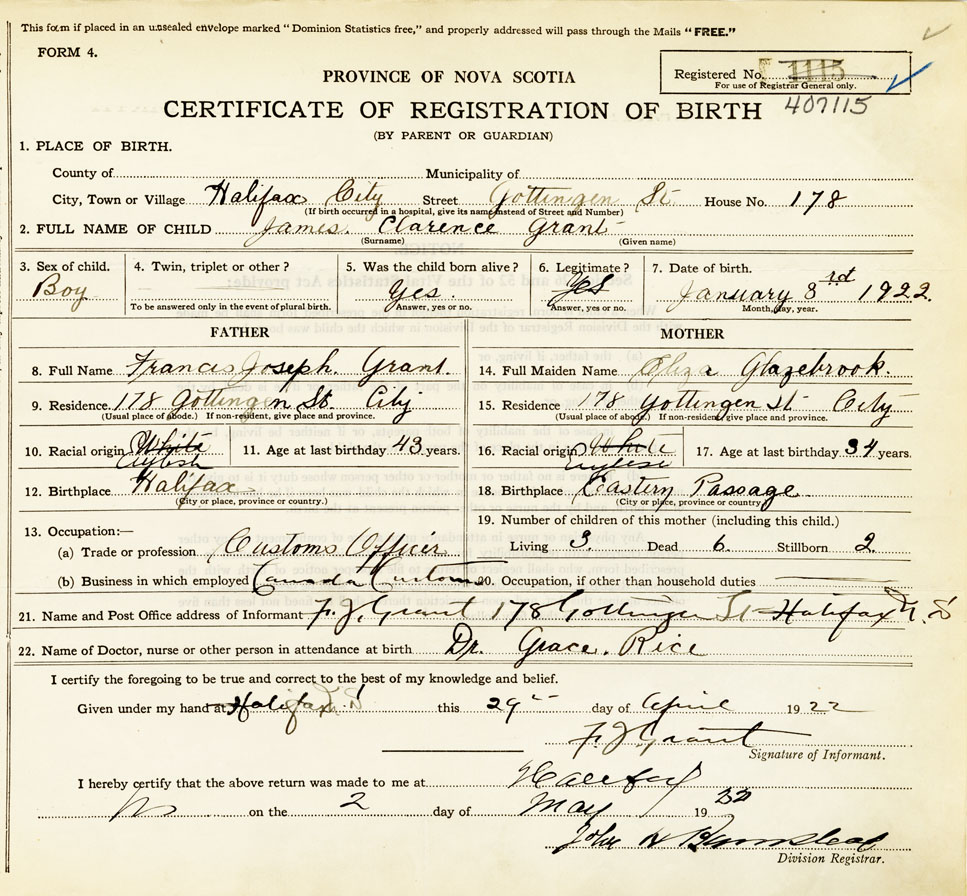 21. Name and Post Office address of Informant F. J. Grant 178 Gottingen St, Halifax N.S.