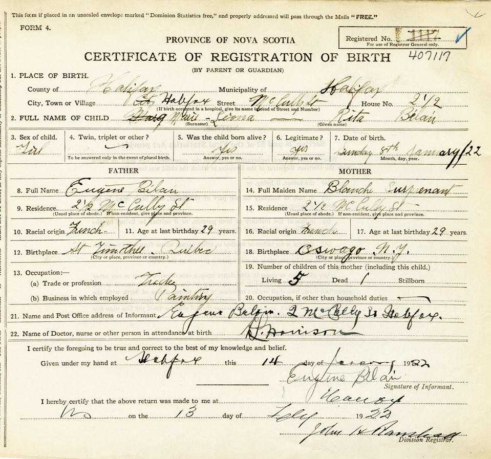 21. Name and Post Office address of Informant Eugene Bilair 2 McCully St Halifax