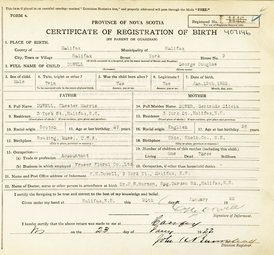 21. Name and Post Office address of Informant C.H. Dowell 3 York St., Halifax