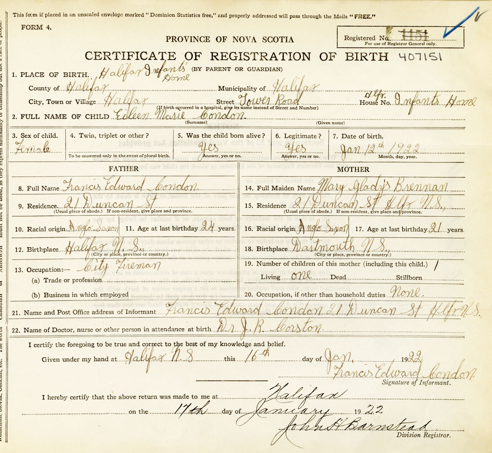 21. Name and Post Office address of Informant Francis Edward Condon 21 Duncan St Halifax