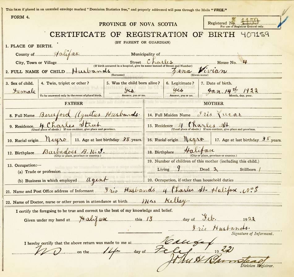 21. Name and Post Office address of Informant Iris Husbands 4 Charles St., Halifax