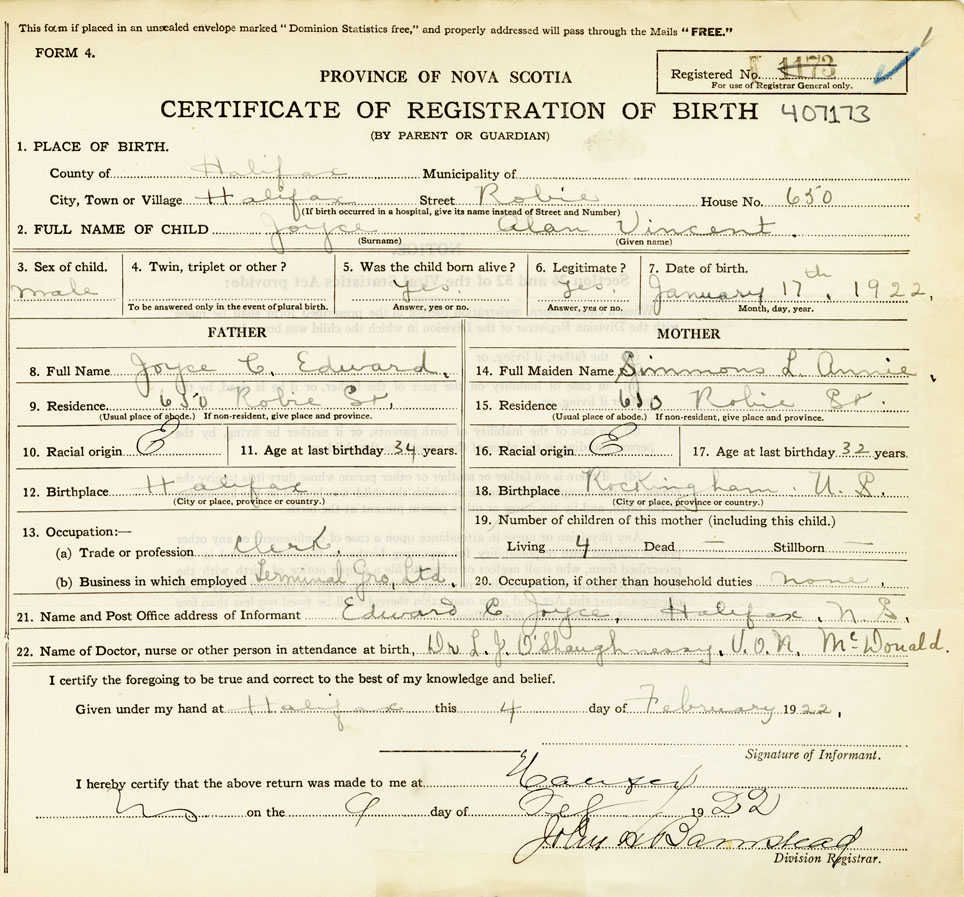 21. Name and Post Office address of Informant Edward C. Joyce Halifax