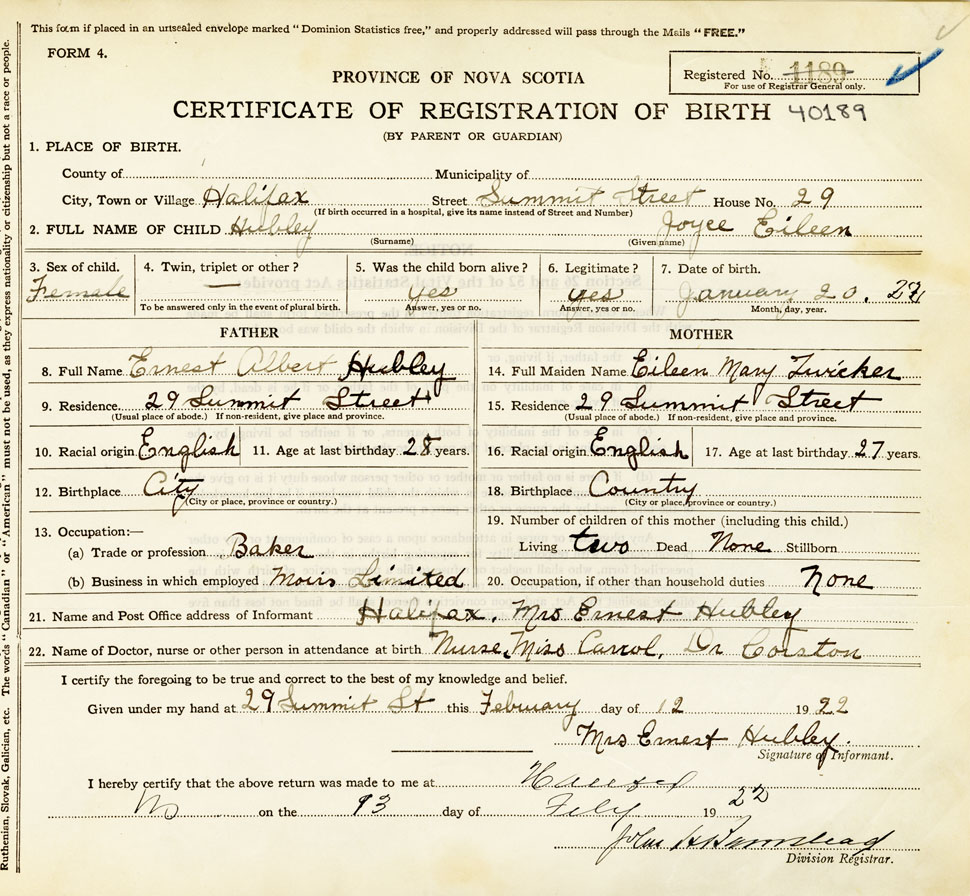 21. Name and Post Office address of Informant Mrs. Ernest Hubley Halifax