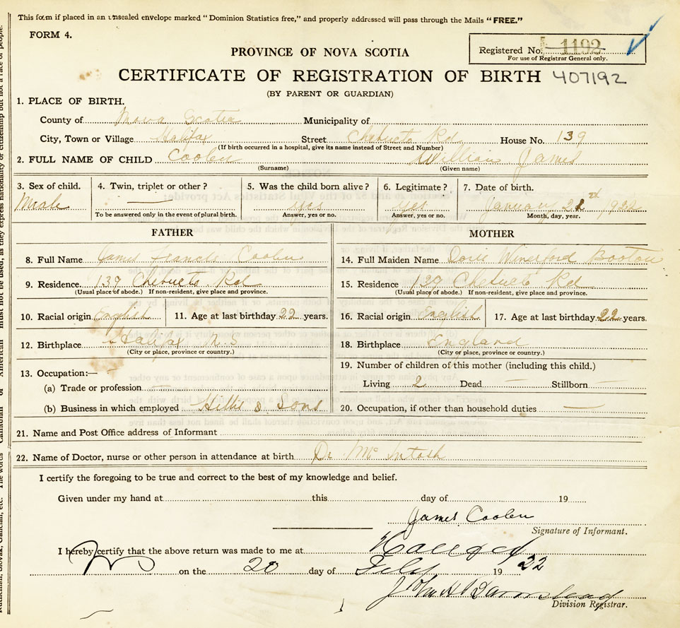 21. Name and Post Office address of Informant James Coolen 139 Chebucto Rd.