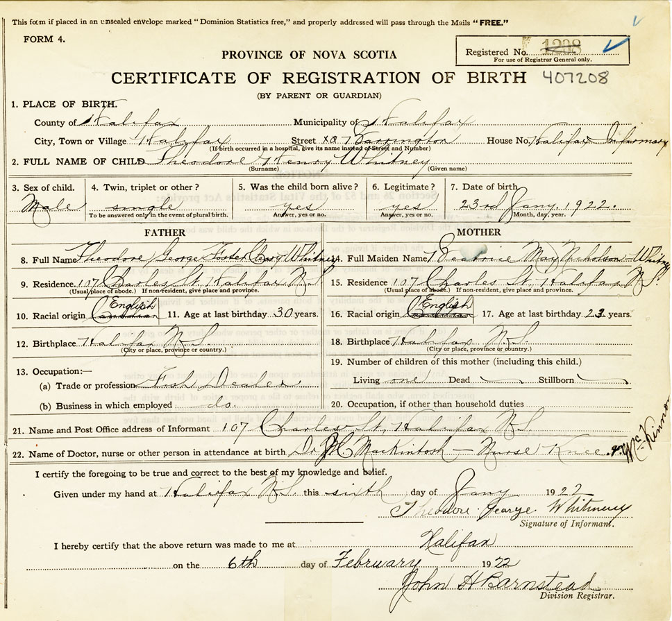 21. Name and Post Office address of Informant Theodore George Whitney 107 Charles St, Halifax