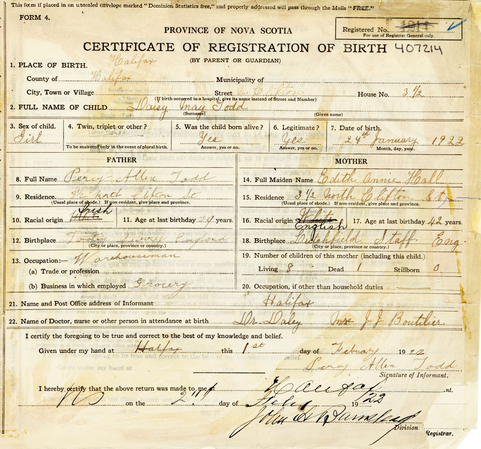 21. Name and Post Office address of Informant Percy Allen Todd Halifax