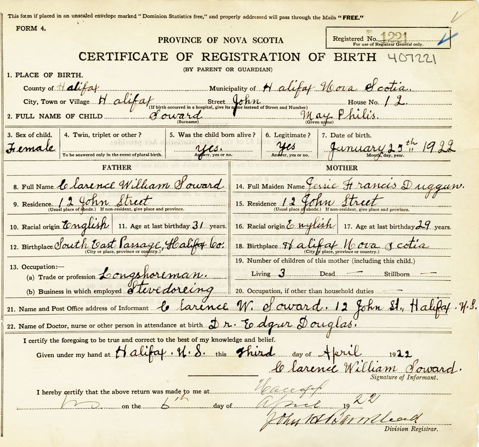 21. Name and Post Office address of Informant Clarence W. Soward 12 John St., Halifax