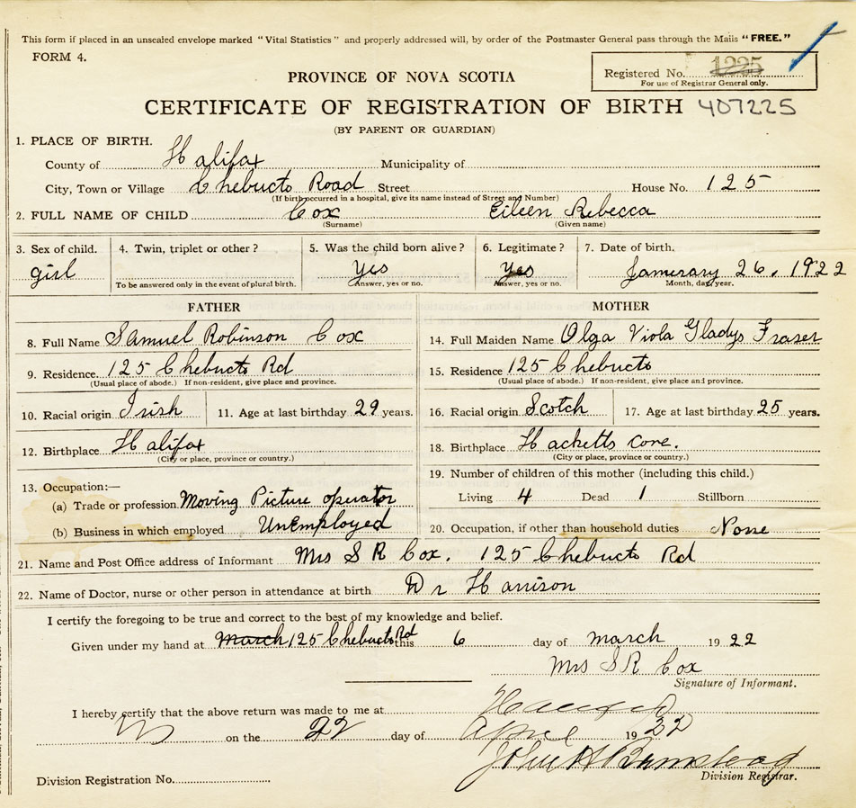 21. Name and Post Office address of Informant Mrs S R Cox 125 Chebucto Rd