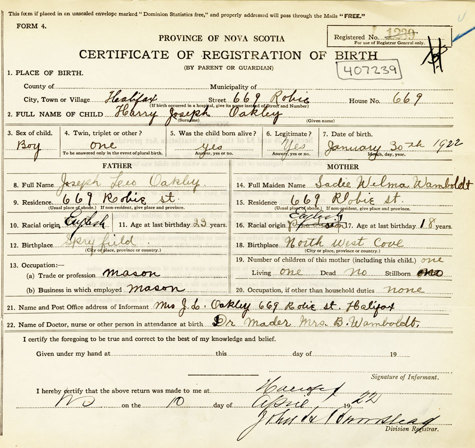 21. Name and Post Office address of Informant Mrs. J. L. Oakley 669 Robie St., Halifax