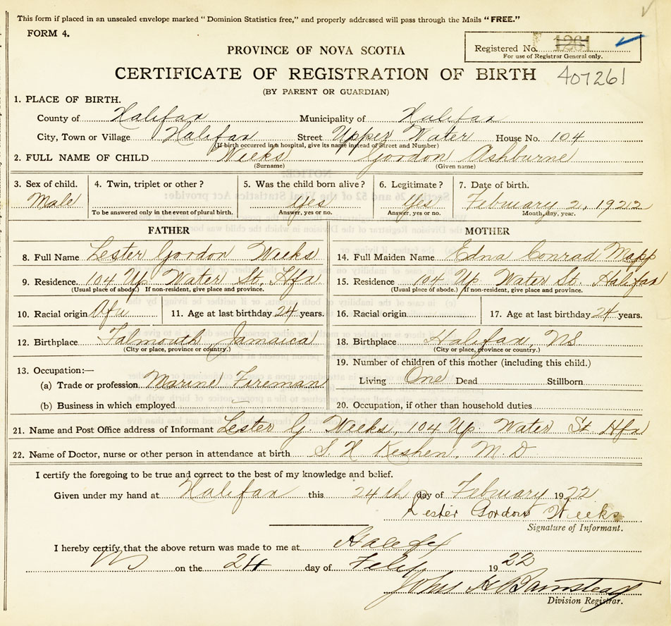 21. Name and Post Office address of Informant Lester G. Weeks 104 Up. Water St., Hfx.