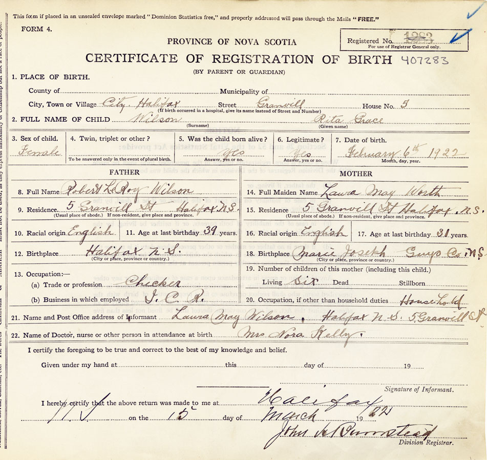 21. Name and Post Office address of Informant Laura May Wilson 5 Granville St., Halifax