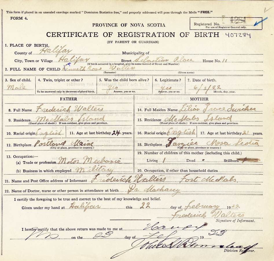 21. Name and Post Office address of Informant Frederick Walters Fort McNab