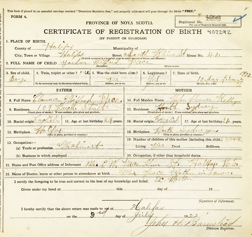 21. Name and Post Office address of Informant Mr. C. W. Pace Elm Street, Halifax, N. S.