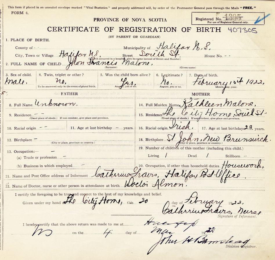 21. Name and Post Office address of Informant Cathrrine Grairs, Nurse Halifax Post Office