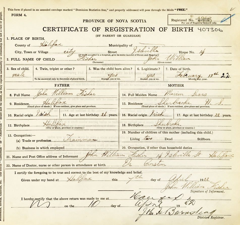 21. Name and Post Office address of Informant John William Fisher 14 Isleville St., Halifax