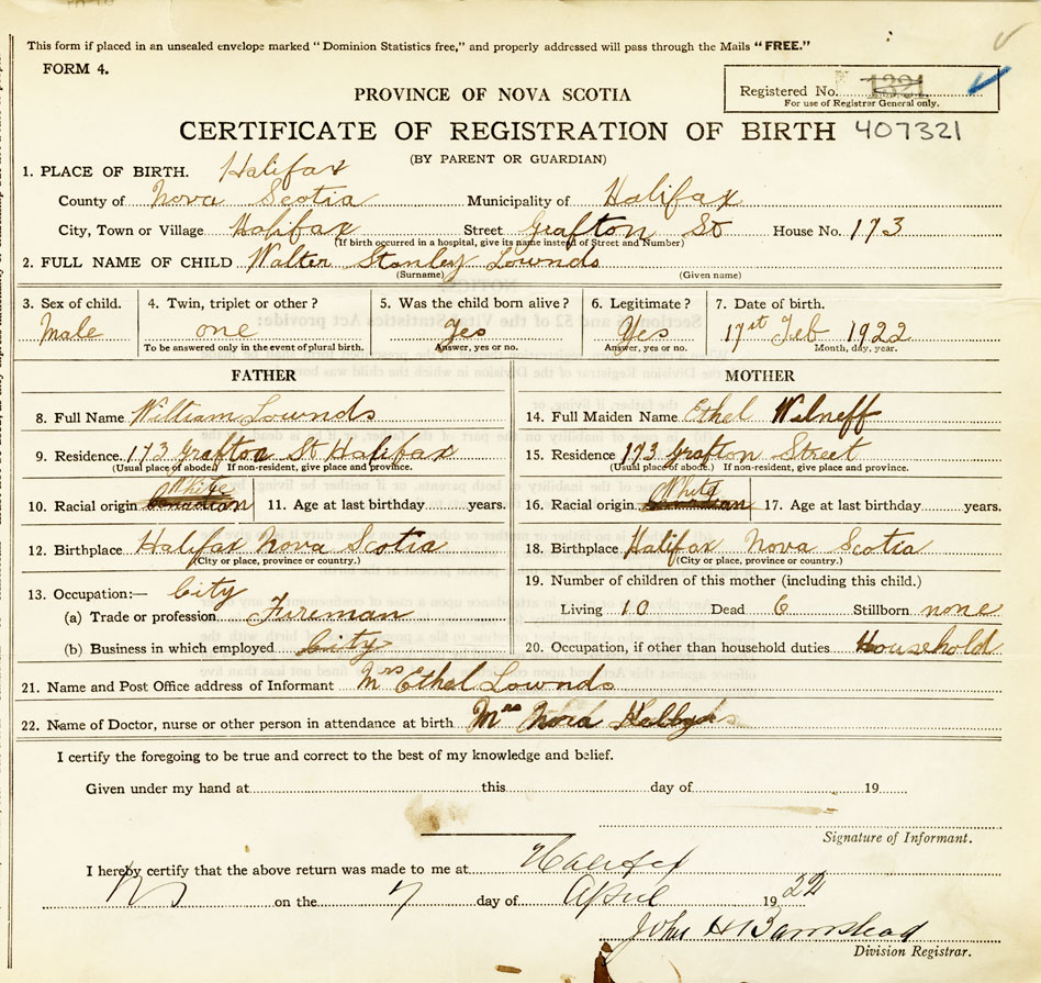 21. Name and Post Office address of Informant Ethel Lownds 173 Grafton St, Halifax, Canada