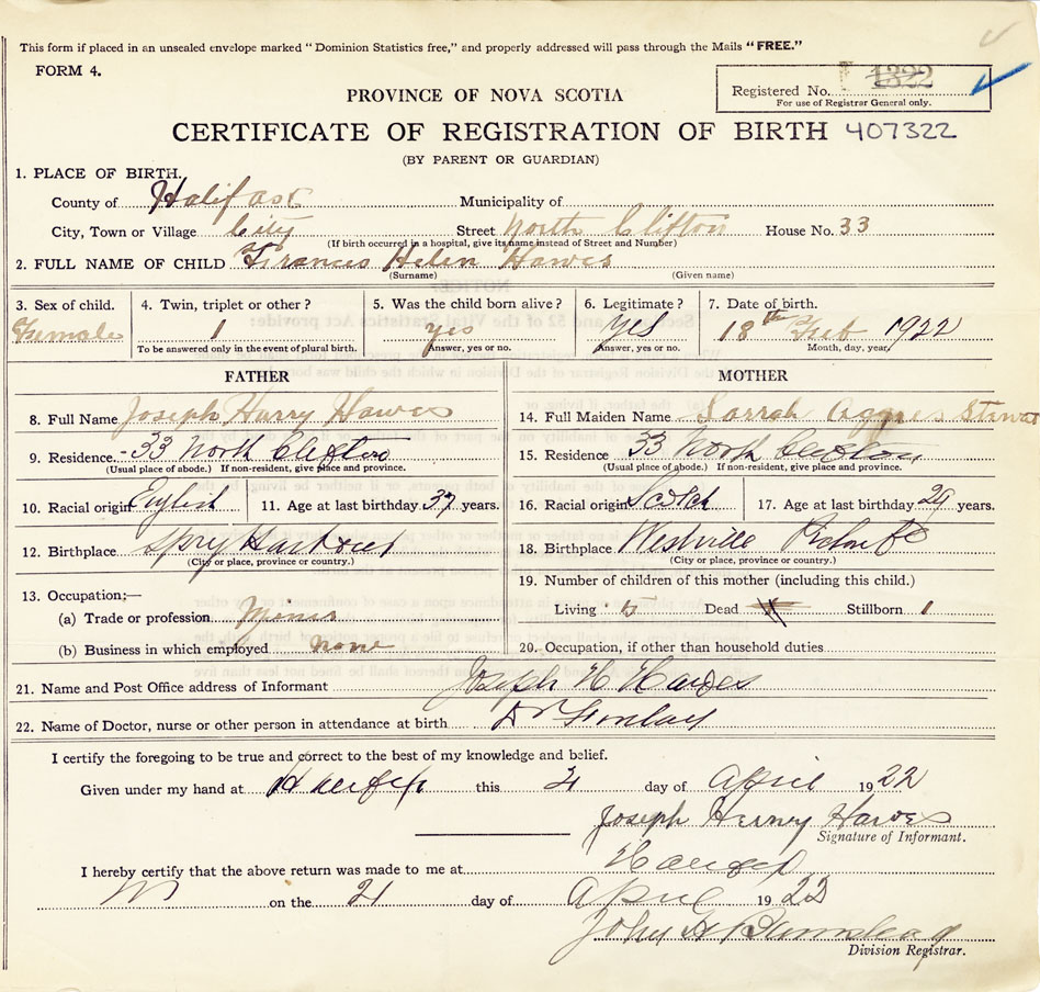 21. Name and Post Office address of Informant Joseph H Hawes 33 N Clifton, Halifax, Canada