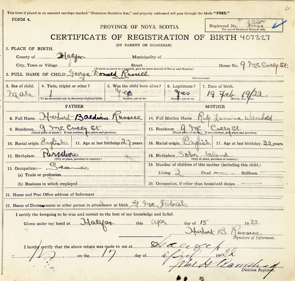 21. Name and Post Office address of Informant Herbert B Russell 9 McCully St, Halifax, Canada