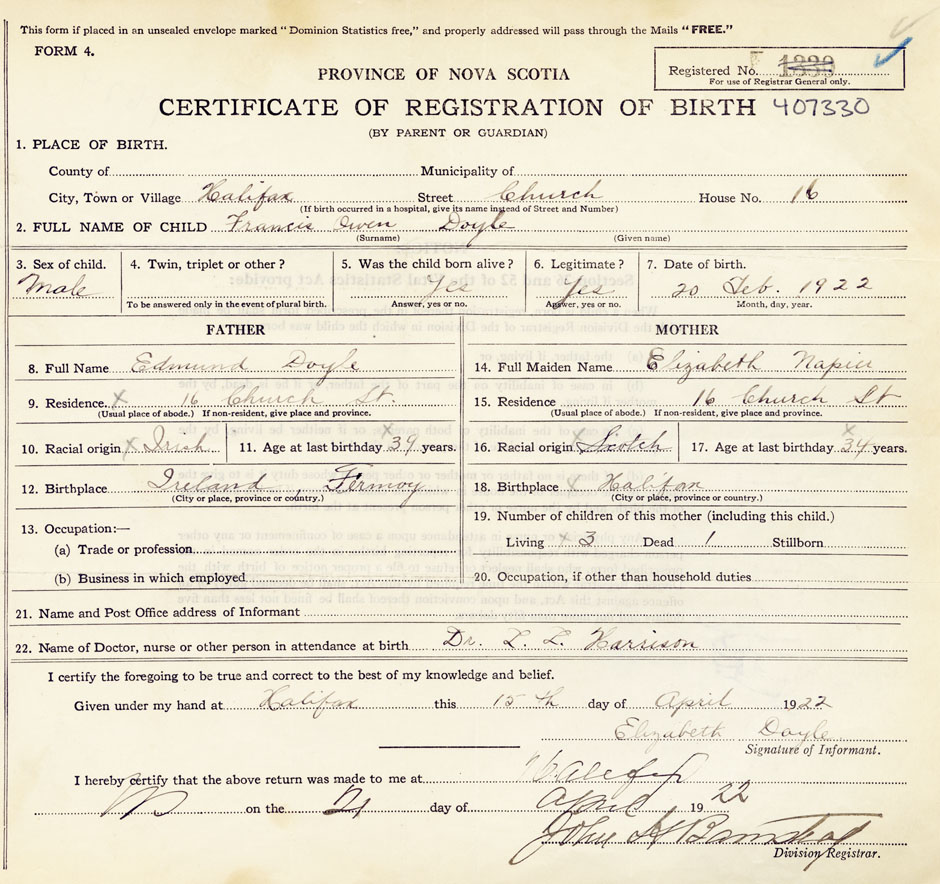 21. Name and Post Office address of Informant Elizabeth Doyle 16 Church St, Halifax, Canada