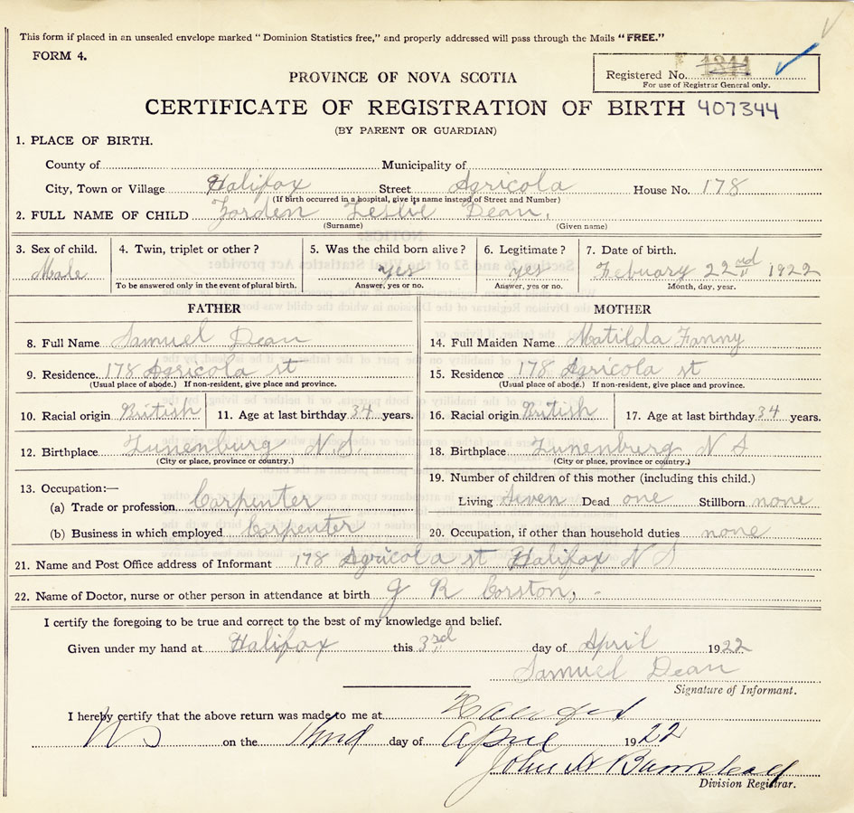 21. Name and Post Office address of Informant Samuel Dean 178 Agricola St, Halifax, Canada