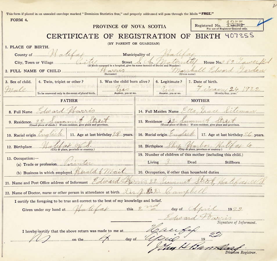 21. Name and Post Office address of Informant Edward Harris 22 Summit St, Halifax, Canada