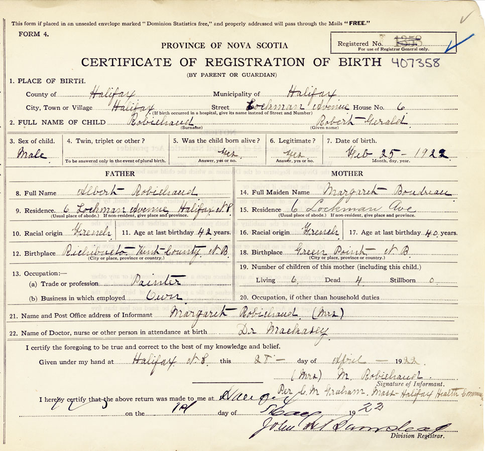 21. Name and Post Office address of Informant Margaret Robichaud 6 Lockman Ave, Halifax, Canada