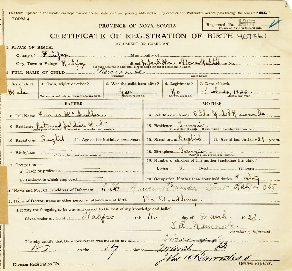 21. Name and Post Office address of Informant Ella Newcombe 83 Windsor St., Halifax