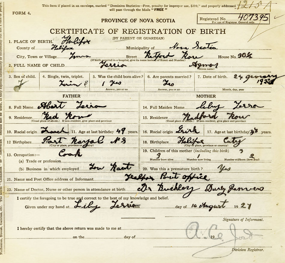 21. Name and Post Office address of Informant Lily Terrio Halifax Post Office