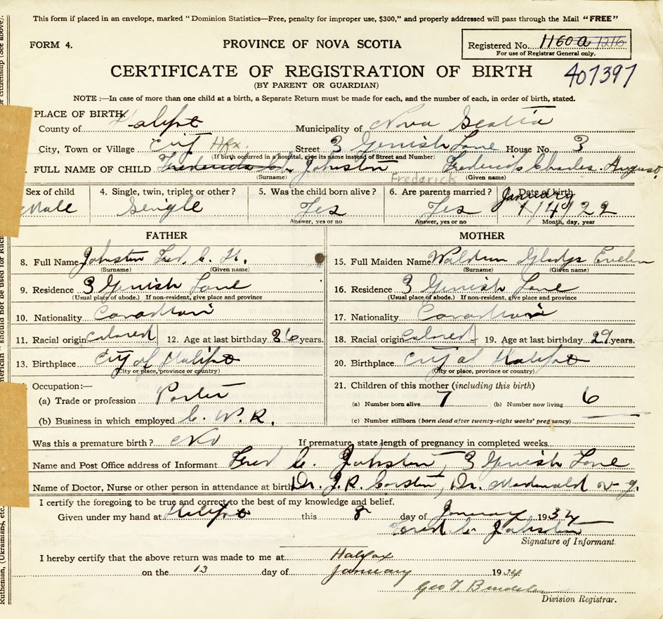 21. Name and Post Office address of Informant Frederick C. Johnston 3 Gerrish Lane, Halifax