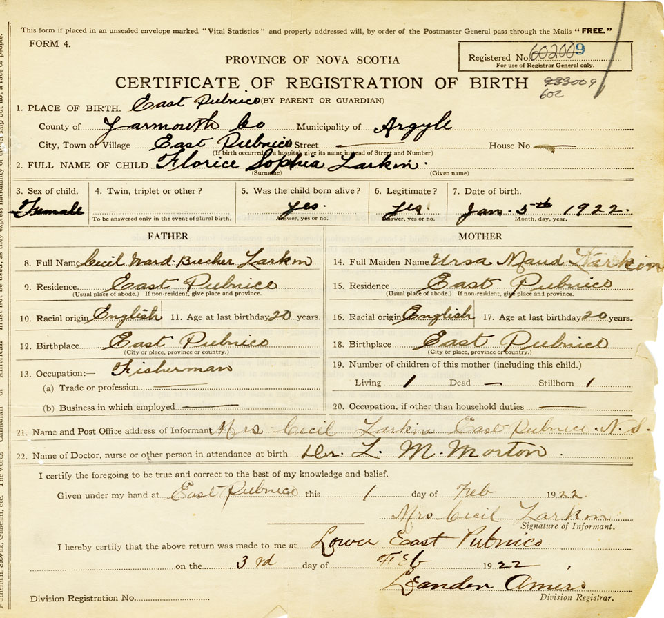 21. Name and Post Office address of Informant Mrs Cecil Larkin East Pubnico, Yarmouth County