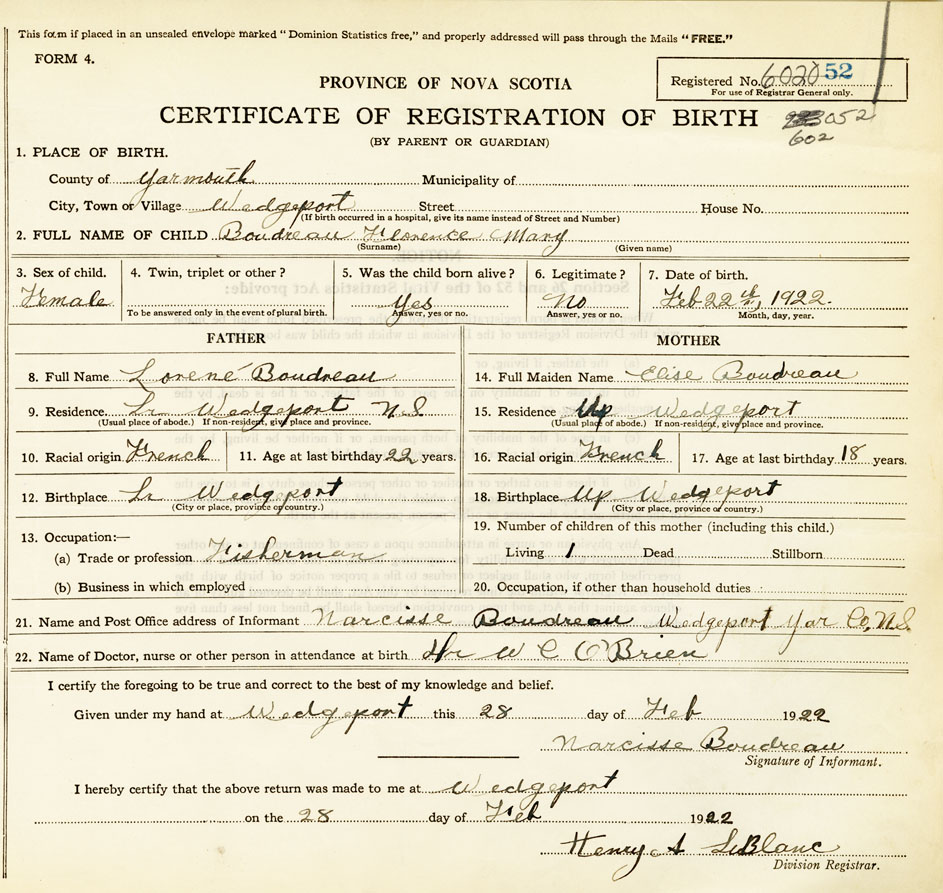 21. Name and Post Office address of Informant Narcisse Boudreau Wedgeport. Yar.